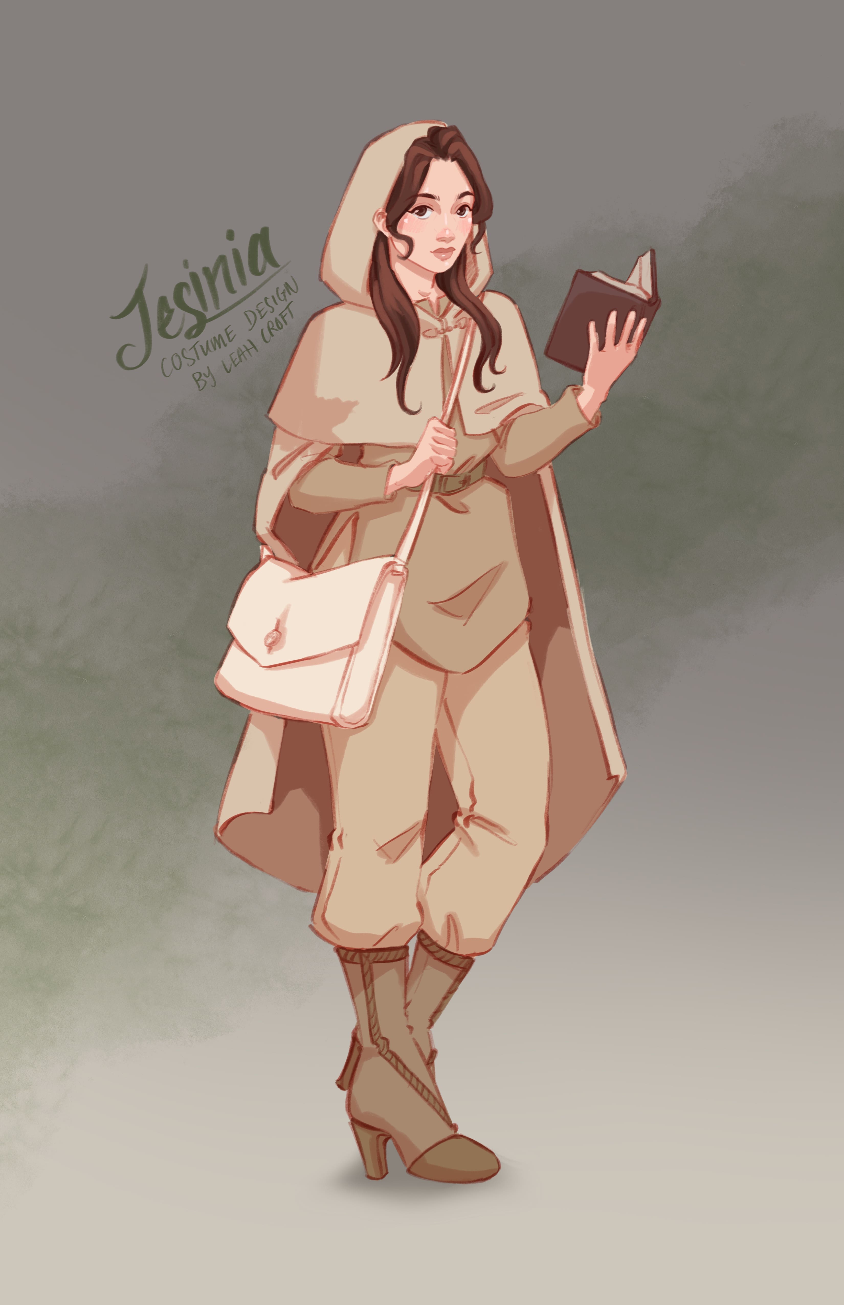 Jesinia has brown eyes[8] and long brown hair covered by a cream tunic and hood with a golden rectangle on her shoulder. By 334 AU, her second year at Basgiath, her hair has grown long enough that it nearly reaches her waist when worn in a braid. Her build is slight.[9] She is deaf and uses sign language to communicate with others.[1]